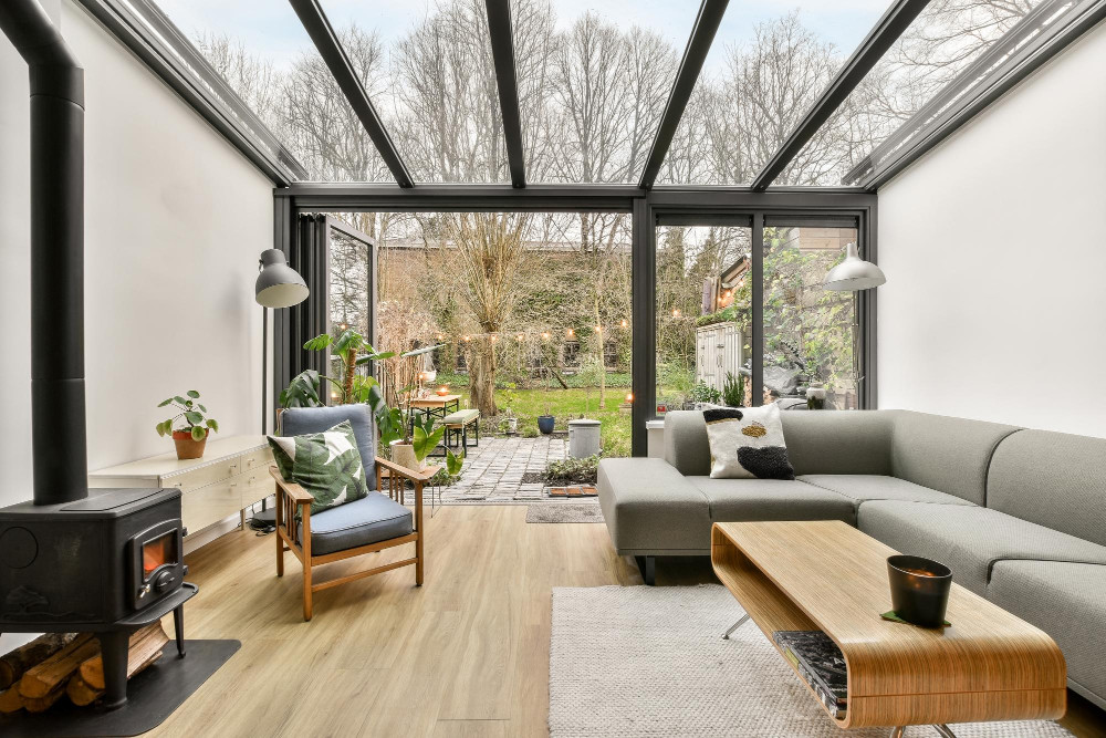 A sunroom creates a practical space for morning coffee, reading, or relaxing while extending the home’s floor plan without the cost of traditional construction. Large glass panels connect the interior to the backyard while a solid frame protects furniture from rain and wind.